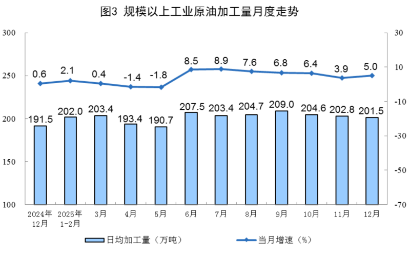 原油加工增速加快。12月份,规上工业原油加工量6246万吨,同比增长5.0%,增速比11月份加快1.1个百分点;日均加工量201.5万吨。