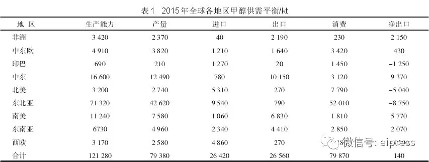 由表 1 可见,全球甲醇市场 2015 年合计销量79 380 kt,平均开工率65%,其中,主要供应地区是中东、南美、东南亚,东北亚地区,其次是北美和西欧。东北亚是主要消费区域和主要生产区域,其产能占全球产能的58%,其次是中东,占全球产能的 14%,南美,占全球产能 9%。从净出口角度,中东和南美产量大部分用于出口,自身消费量不大。