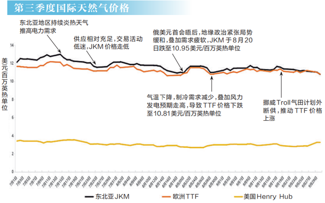 气价方面,7月,受亚洲需求偏弱以及挪威管道气流量恢复的影响,TTF价格走低。后续欧洲储气库平稳注气,市场情绪偏向乐观,气价小幅走跌。第三季度,TTF均价为11.29美元/百万英热单位,环比降幅达5%,同比降幅达2%。