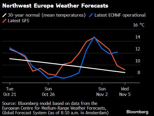 基准期货价格在每兆瓦时32欧元附近窄幅波动,此前两个交易日累计下跌近2%。部分气象模型显示,大型天然气消费国所在的西北欧地区,11月初气温可能远高于往年同期。