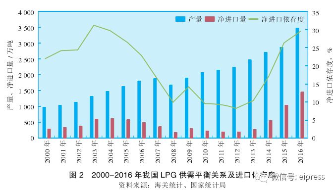 我国LPG产量逐年上升。2000年LPG产量为1007万吨,2007年增长至1934万吨。受金融危机影响,2008年产量降幅较大,2009年开始回升,2016年达3503.9万吨,首次超过3000万吨,同比增长20.1%,远超过原油加工量2.8%的增幅。2000–2016年,我国LPG产量年均增速达8.1%,而同期原油加工量增速为6.1%(见图1)。