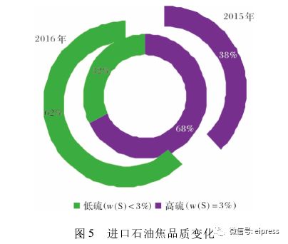 从品质比例上分析,高硫焦受国内环保要求超严因素影响,2016年呈下降趋势。如图5所示,2015年中国进口石油焦中高硫焦3.97Mt,占比68%;2016年高硫焦进口量为1.62Mt,占比仅为38%,高硫焦进口量同比下降59%。