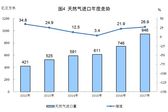 天然气进口持续快速增长。2017年,天然气进口946.3亿立方米,比上年增长26.9%;进口量与国内产量之比由2012年的0.4:1扩大到0.6:1。