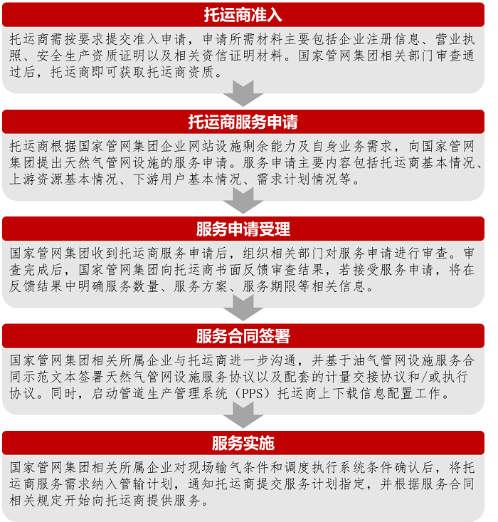托运商需按要求提交准入申请,申请所需材料主要包括企业注册信息、营业执照、安全生产资质证明以及相关资信证明材料。国家管网集团相关部门审查通过后,托运商即可获取托运商资质。(编者注:放低门槛欢迎各方进入,获取托运商资质较为容易)