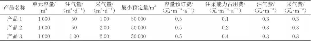 固定储气产品是指:在注气期固定接收用户来气并注入储气库,储存至采气期固定采出并交付给用户的服务。用户需要根据预定量缴纳预定费,根据实际使用量缴纳使用费。合同中具体约定储气能力和注采需求,包括最大储气能力、最大日注气量、最大日采气量3 个参数,并依据费率表计算服务费用,按月支付。