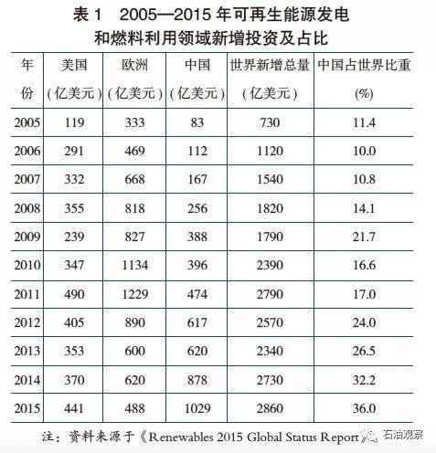 我国替代能源供给能力增长迅速,截至 2015 年底,发电容量、风能发电容量、太阳能热水器容量等指标位居世界第一,我国可再生能源消费总量已达6270×104t 油当量,占世界比重达17.2%;核能消费总量达 3860×104t 油当量,占世界核能消费总量的 6.6%。在可再生能源中,太阳能和风能的消费总量世界占比分别达 15.5% 和 22%,地热能、潮汐能等消费总量的世界占比也达 10.2%。新增投资占世界比重明显扩大,2005—2015 年,我国在可再生能源发电和燃料利用领域的新增投资从 83 亿美元快速增长到 1029 亿美元, 年均增速达 28.6%(表 1、表 2)。