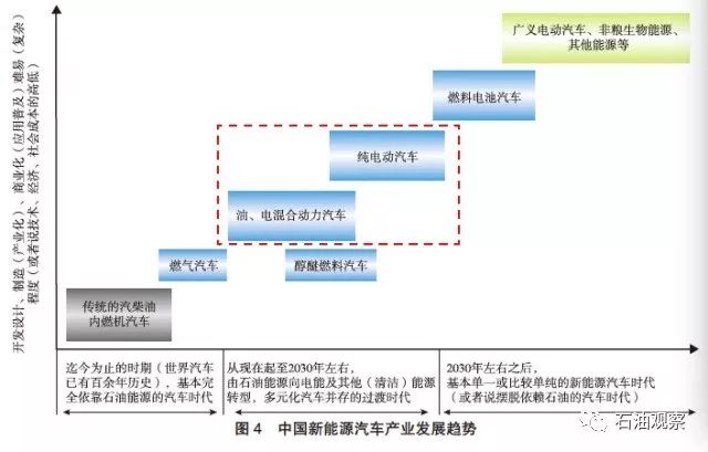 从短期看,我国已经进入汽车社会,大城市的增购换购潮、三四线城市潜力的激活,会释放巨大的消费需求;各大城市陆续实施限牌限行政策也将刺激新能源车消费;政府推动新能源客车对传统客车的替代以及新能源出租车和轨道交通的快速发展等因素将导致我国新能源汽车迎来一轮快速发展期。但是,供电能力偏弱导致较短的续航里程,制约了纯电动车发展;电动汽车生产成本较高,缺乏市场竞争优势。从长期看, 随着电动汽车电池技术和储电性能的提升、配套基础设施日臻完善及汽车分享技术的实现,新能源汽车的发展将迈上新台阶(图 4)。
