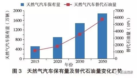 电动汽车充电问题一直困扰着行业快速发展,电动汽车充电站大多局限于电动公交汽车或内部集团用车,还没有建成真正面向不同用户的充电站服务网络。因此,车用替代燃料在短期内仍以天然气为主。中长期看,随着电动汽车技术的不断突破使成本逐渐下降, 充电便利性不断提高,智能电网建设也将进一步促进电动汽车发展,电力将取代天然气成为车用替代燃料的主要能源。利用 Bass模型测算我国天然气汽车保有量,2020 年、2030 年和 2050 年天然气汽车对石油的替代率分别为 2.5%、4% 和 6.5% 左右(图 3)。