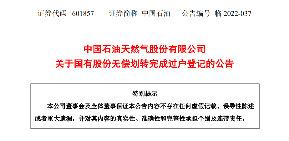 近日,中国石油天然气股份公司接到控股股东中国石油集团转来的由中国证券登记结算有限责任公司出具的《过户登记确认书》,确认上述国有股份无偿划转的股份过户登记手续已办理完毕。